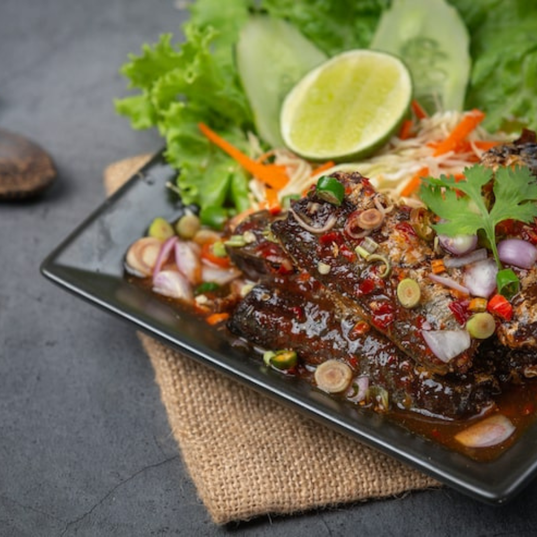 Tender fish cubes tossed in a spicy chilli-garlic sauce with onions and capsicum. Fiery, tangy, and full of flavor-an irresistible Indo-Chinese favorite.