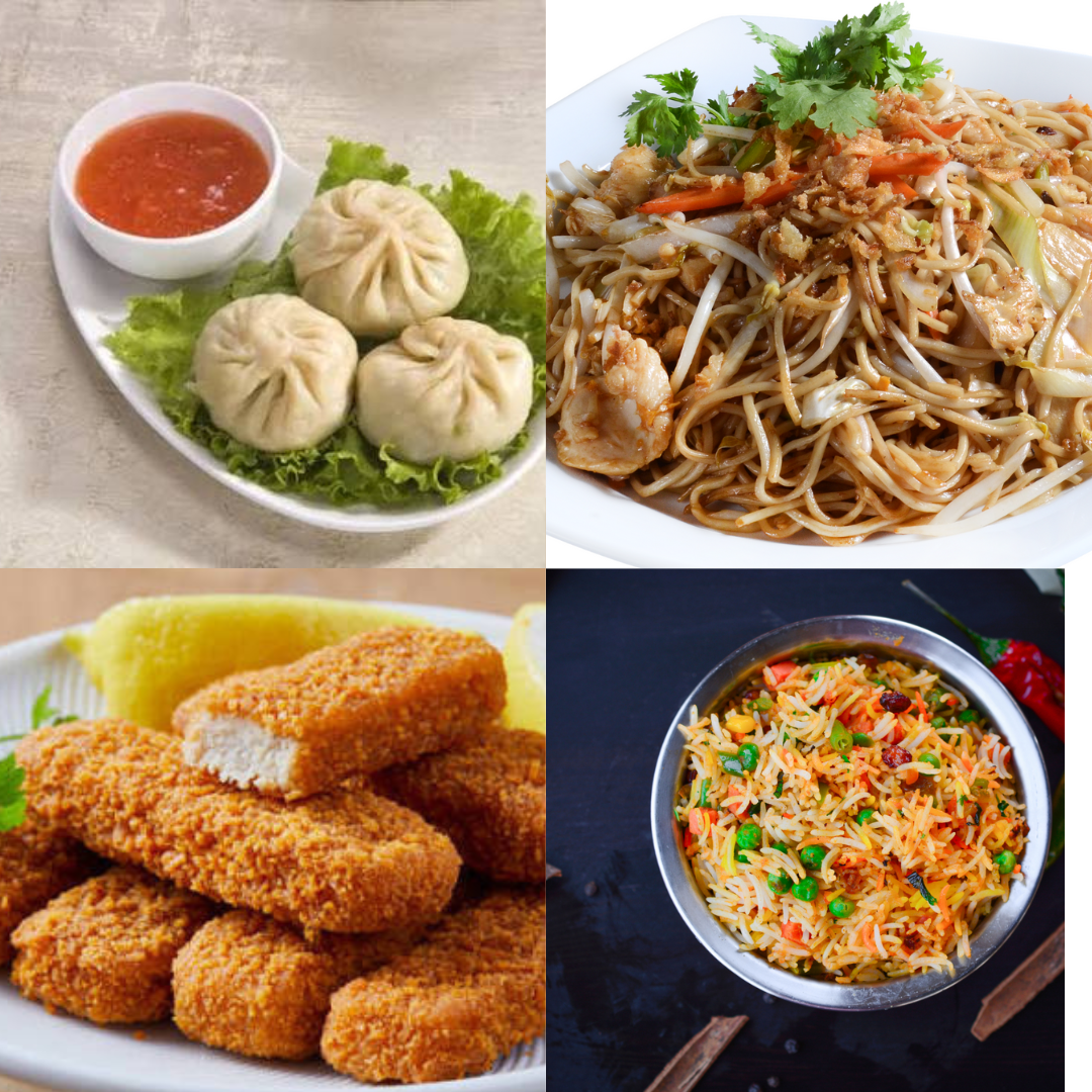 A wholesome platter with the best of both worlds! Relish Veg Fried Rice and Veg Noodles paired with 4 pcs juicy Chicken Manchurian, 2 pcs Veg Manchurian, 2 crispy Fish Fingers, and 3 soft, flavorful Momos. A delicious variety packed into one meal.