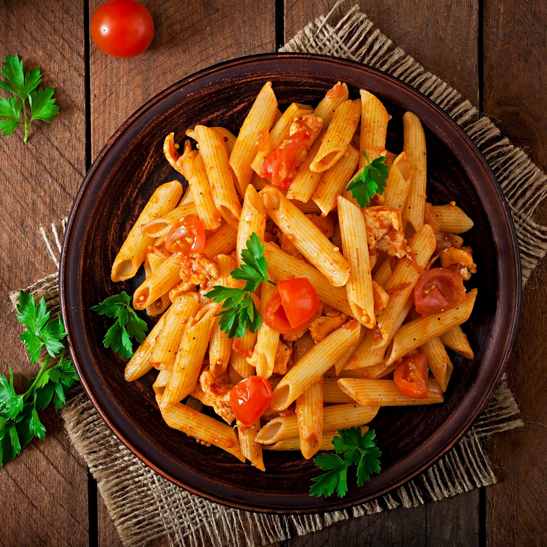Al dente pasta tossed in a rich, tangy tomato-based sauce with herbs and spices. Available with fresh vegetables or tender chicken, it's a flavorful and hearty Italian-inspired delight.